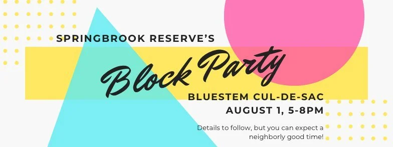 The 2026 Annual Block Party will be Saturday, August 1, 2026 at 5PM - 8PM on Bluestem Ln
